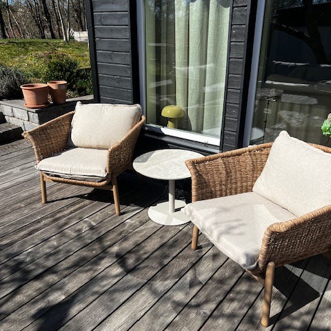 Möbelgruppen är utformad för uteplats eller balkong. Fåtöljerna har raka trästommar med sitt- och ryggdynor. Soffan har ribbad sits och rygg i samma träutförande. Soffborden har ribbad bordsskiva i trä och fyrkantig form. Passar som sittgrupp för flera personer på altan, terrass eller balkong.