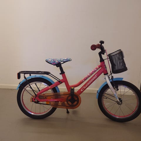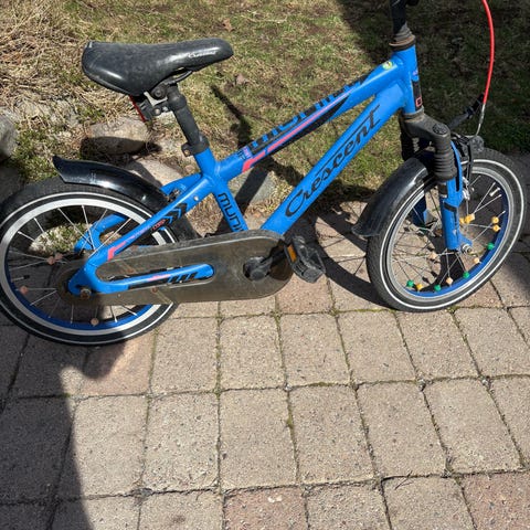 Crescent barncykel med 16" hjul. Cykeln har ram i lila färg med matchande skärmar. Utrustad med kedjeskydd, fotbroms bak (handbromsen fungerar ej och kan tas bort).