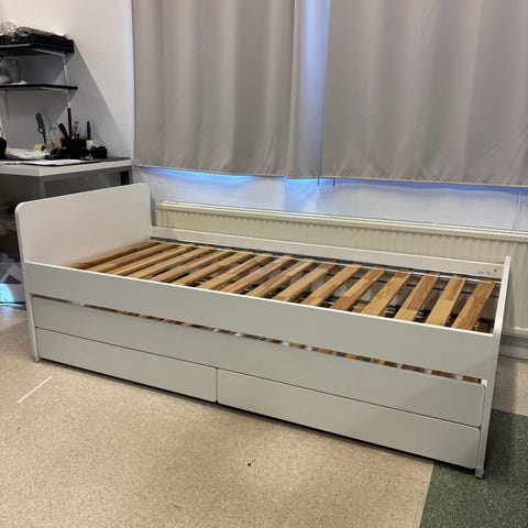 En vit sängstomme från IKEA med svarta förvaringslådor, 98x207x45. Passar till resårmadrass 90x200.