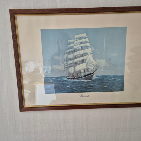 Tavla med motiv av segelfartyg till havs. Bilden är monterad med passepartout och inramad i en träram i mahognyfärg med glas. Format: höjd 54 cm bredd 75 cm. Passar som väggdekoration i exempelvis vardagsrum, hall eller kontor. Finns två tavlor med olika motiv.