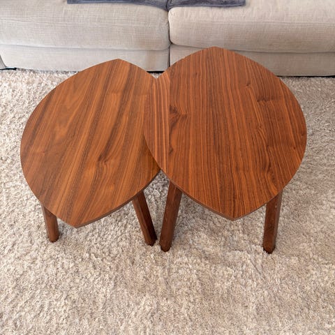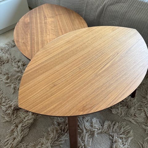 Säljer ett set med 2 satsbord/nästbord från IKEA STOCKHOLM. Snygg modell i valnötsfaner med ben i massiv valnöt. Kan användas tillsammans som soffbord eller var för sig som sidobord.