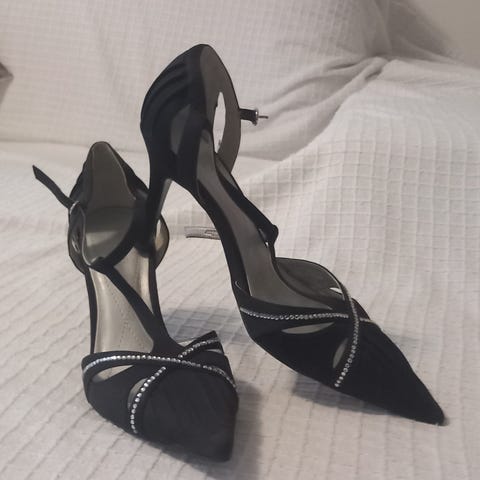 Gina Tricot klackskor i svart färg, storlek 36. Skorna har smal, hög klack och spetsig tå. Ovandel i textil med slät yta och innersula i ljus ton. Passar till exempelvis fest, vardagsbruk eller andra tillfällen där klackskor önskas.