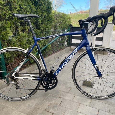 Crescent landsvägscykel för herr med 28" hjul (700c). Cykeln har herrram och är utrustad med pakethållare bak, stänkskärmar, stöd och kedjeskydd. Färgen är blå. Passar för pendling och vardagscykling på väg och cykelbana.