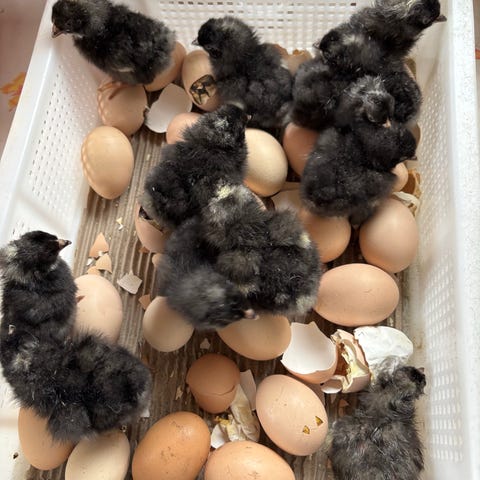 Kycklingar av Skånsk Blomme kläckta v 14-15. Säljes osorterade. Många olika färger.