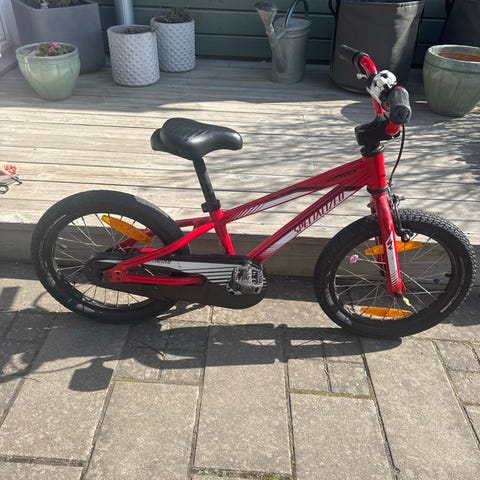 Scott voltage barncykel med 16" hjul. Cykeln har orange ram med mönsterdetaljer och blå sadel. Utrustad med skärmar bak och reflexer i hjulen. Lämplig som första cykel med trampor för barn i den storlek som passar 16" hjul. Några skönhetsfläckar på ram och sadel.