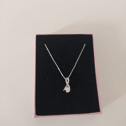 Detta fashionabla rhodiumpläterade silverhalsband utmärker sig genom sitt hänge som består av tre sammanflätade cirklar, varav en är dekorerad med vita oxider som ger en lysande och delikat touch.