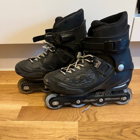 Inlines rullskridskor i svart färg, storlek 44. Modellen har hårt yttre skal med vadderad innersko för stöd och komfort. Stängning med snörning, spänne och kardborreband för stabil passform. Utrustade med fyra hjul per skridsko och broms bak på ena skridskon. Passar för rullskridskoåkning utomhus på asfalt eller liknande underlag.