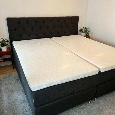 Säng med stoppad gavel i blått sammetstyg. Sängen har en vadderad huvudgavel som ger stöd vid sittande. Sängen är 210x210 cm och rymmer 2 vuxna + barn om man önskar. Väldigt rymlig. Varsamt använd, har använts i ca 2 år.