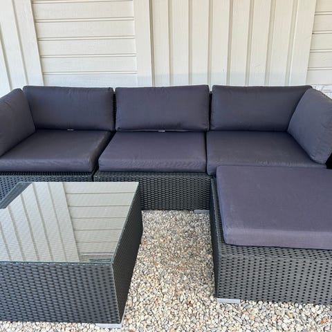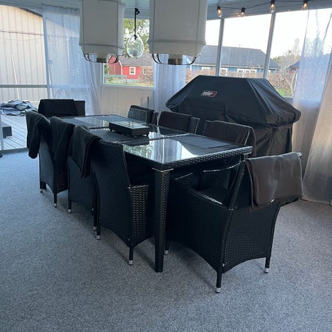 Fint glasbord och fyra stolar. Lite skavanker finns men inget som stör funktionen. Finns i Landön Offerdal.