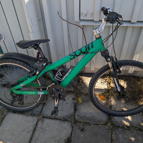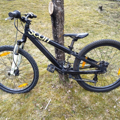 Scott barncykel med 24" hjul i svart färg. Cykeln har framgaffel med dämpning, skivbromsar fram och bak samt växlar med reglage på styret. Utrustad med plattformspedaler, sadel anpassad för barn och reflexer i hjulen. Passar barn som behöver en cykel i 24-tumsstorlek för vardagscykling och enklare turer på blandat underlag.