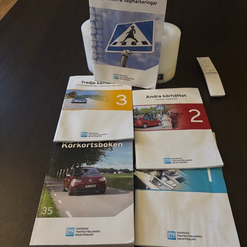 Körkortsboken, Handledarboken, Studiehäftet, vägmärkesförteckning, vägmärkestest och vägmärken & and vägmarkeringar häftet.