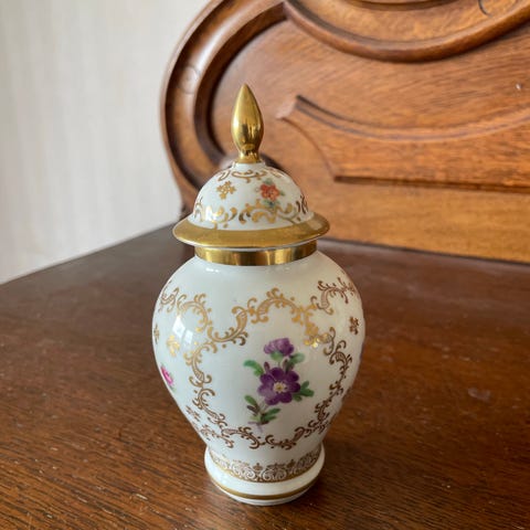 Säljer en mycket elegant och välbevarad lockurna från tyska Schumann Arzberg (Bavaria). Urnan är tillverkad i vitt kvalitetsporslin och pryds av ett klassiskt blommönster med vackra, detaljrika guldekorationer.