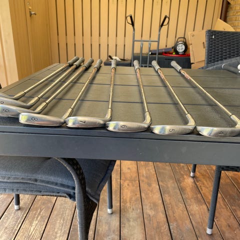 Omgreppade 2024, fortfarande väldigt bra grepp. Grepp är Golf Pride tour wrap (vit).
