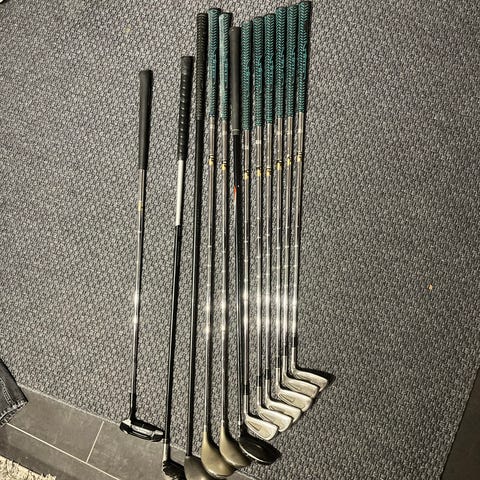 Motocaddy golfbag med putter och järnklubborna från sandwedge till järn 5. Järnklubborna är ett bra ny börjar set och gjort för typ juniorer. Fint golfsätt och fungerar bra.