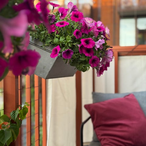 Paraply i beige färg med dekorativa fransar längs kanten. Passar för användning på balkong för att ge skugga.