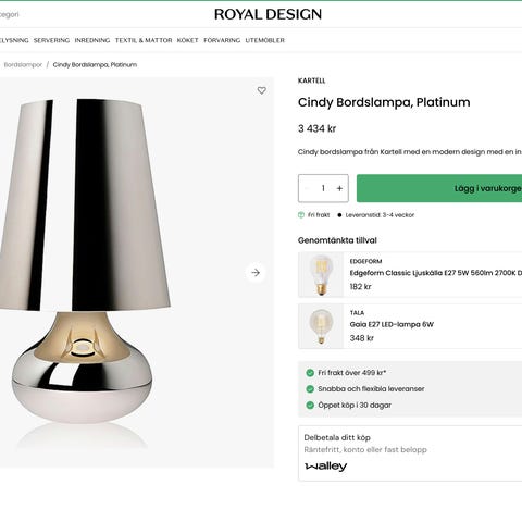 Kartell lampa Cindy – i färgen platinum säljes för 2000kr (nypris 3400kr)