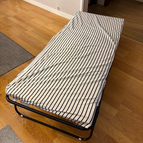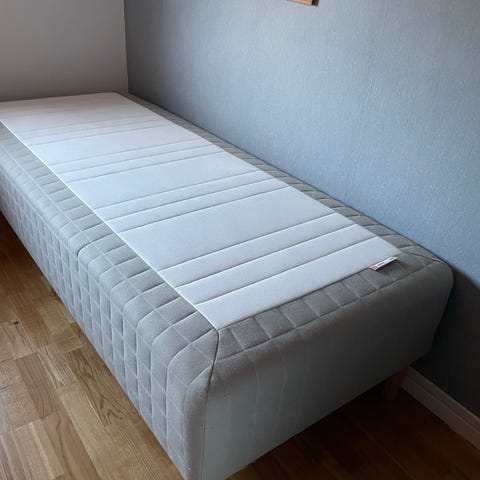 IKEA säng med resårbotten och ribbotten i trä. Sängen har en beige resårbotten/ram med lösa ribbor i trä som stöd för madrass. Passar som enkel- eller gästsäng beroende på mått. Lämplig för sovrum eller gäststuga. Madrass och textilöverdrag enligt bilder.