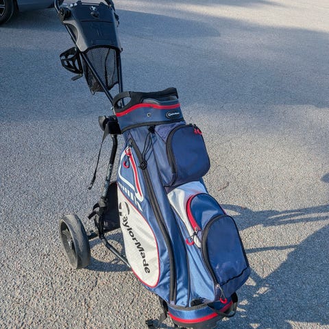 Golfbag med vagn i blå och beige färg. Väskan har flera fack för klubbor med uppdelade sektioner upptill för att hålla klubborna åtskilda. Utsidan har flera dragkedjeförsedda fickor för förvaring av bollar, handskar och annan utrustning. Golfbagen är monterad på en tvåhjulig vagn med handtag för enkel transport runt banan. Passar för förvaring och transport av kompletta golfset.