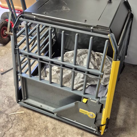 MIM Variocage, hundbur för mellanstor till stor hund, i metall, grå färg, gula detaljer (yellow line). Buren har gallerkonstruktion med frontöppning och låsanordning. Botten är slät och anpassad för att hunden ska kunna ligga eller sitta stabilt. Konstruktionen är avsedd för transport av hund i exempelvis bil eller annat fordon där buren kan säkras. Buren är i bra skick. Vi säljer för att vi har bytt bil. Den är som längst 89 cm nertill (55 cm upptill) Bredd 54 cm och höjd 64 cm.