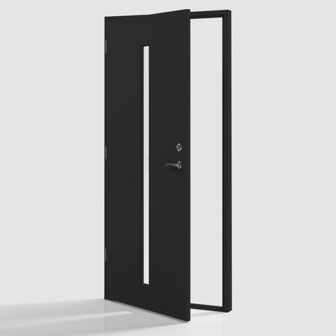 Ytterdörr beg. 10*21 V-hängd svart med avlångt klarglas komplett med karm och låskista. 3950:-