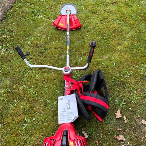 CC 2128 röjsåg med tillbehör. Bensindriven röjsåg med dubbelhandtag och sele. Medföljer olika klingor, bland annat Grass 255-4 och Scarlett-klinga, skydd och övriga delar enligt bilderna. Lämplig för röjning av gräs och sly i trädgård eller på tomt.