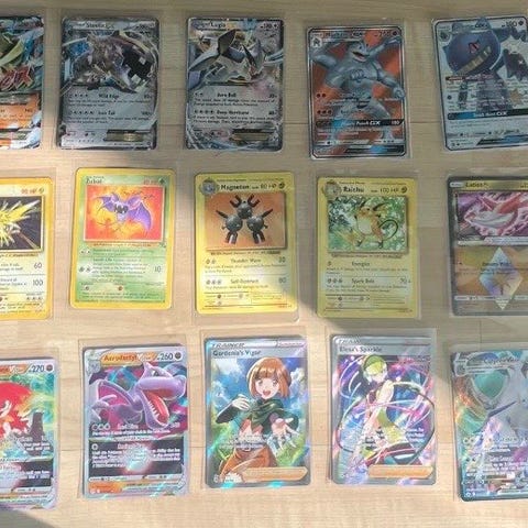 Pokémon samlarkort i blandad uppsättning med flera olika EX- och GX-kort. Kortens motiv visar olika Pokémon-figurer och tränare från Pokémon Trading Card Game. Korten är insatta i plastfickor enligt bilden. Lämpliga för samling eller som komplettering till befintlig Pokémon-kortsamling.