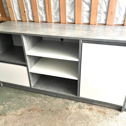 Den har en repa uppepå framtill (se bild) samt utsågade hål för sladdar o förstärkare baktill.