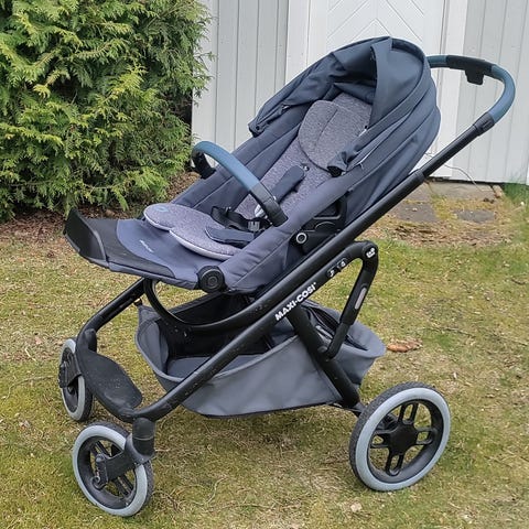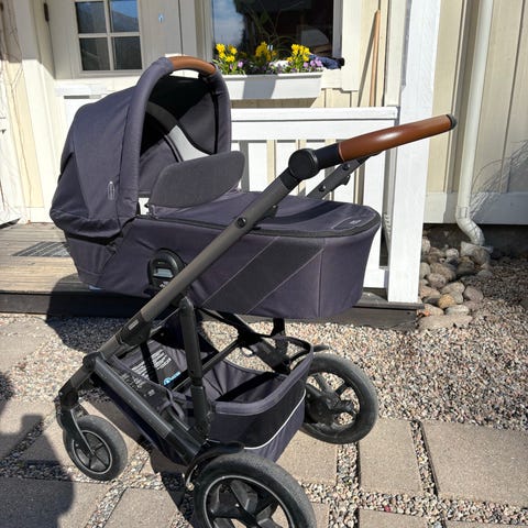 Britax Römer Smile 3 barnvagn med liggdel och babyskydd i blå nyans.