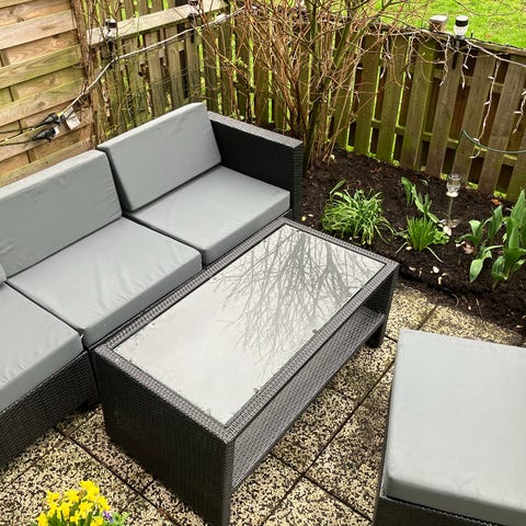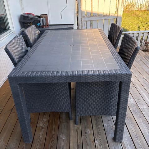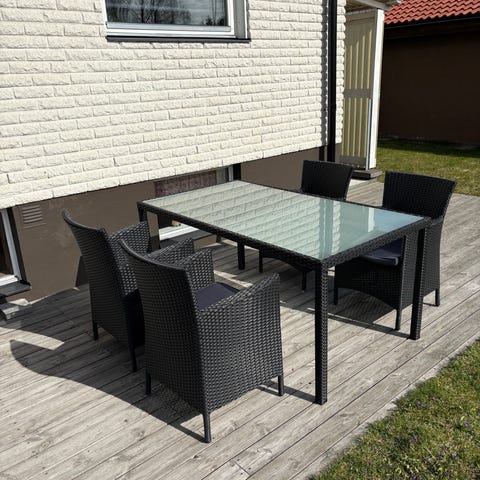 Matgrupp för utebruk bestående av ett rektangulärt bord med och fyra stolar i grå konstrotting. Bordet har en bordsskiva i glas och ben i metall. Passar för placering på altan, uteplats eller balkong som sittgrupp för fyra personer. Fint skick. Finns i Mariehäll, Bromma.