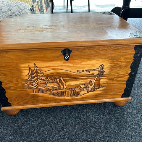 Brun träkista med mått djup 53, längd 85, höljd 48 cm.