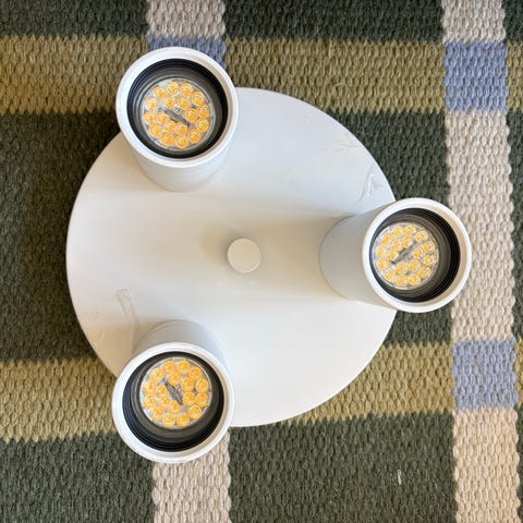 Dosan är kopplad till de tre glödlamporna och kan gr tre olika ljus: starkt, vitt eller gul (varmt).