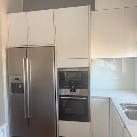 Vit slät front med runda handtag och gångjärnsförsedda dörrar.