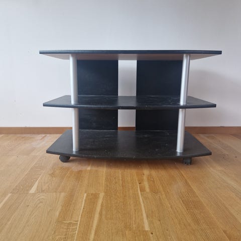 En svart TV-bänk på hjul bortskänkes mot avhämtning. Fint bruksskick.
