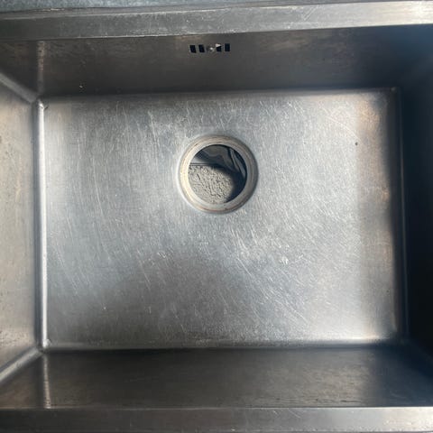 Diskho med ett underskåp och arbetsbänk i grå yta. Rostfri ho med blandare monterad i bänkskivan.