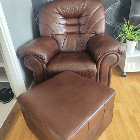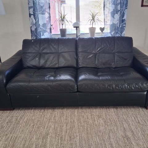 Stilren och bekväm svart skinnsoffa med divan. Soffan är i gott skick.