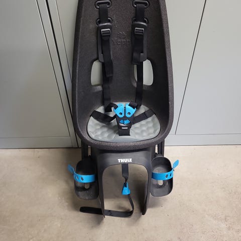 Cykelbarnstol av fabrikat Okbaby med fäste i svart och grått. Stolen monteras bakom cykelns sadel med hjälp av metallbyglar. Utrustad med sele för att spänna fast barnet och hög rygg för stöd.