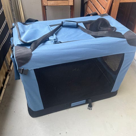 Hopfällbar transportbur för hund i tyg med nätpaneler på sidorna för ventilation och insyn. Buren har dragkedjeöppningar och bärremmar upptill för enklare hantering. Konstruktionen är lätt och kan vikas ihop platt för smidig förvaring och transport. Passar för användning i hemmet, i bilen eller vid resor där en avgränsad och skyddad plats för hunden behövs.