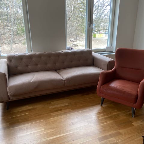 Soffgrupp för vardagsrum i grått tyg. Består av en soffa och två fåtöljer i matchande utförande. Rak och enkel design med stoppade sitt- och ryggdynor. Passar som sittgrupp i vardagsrum eller allrum. Neutral färg som är lätt att kombinera med annan inredning.