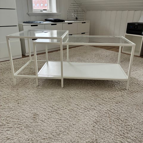 Soffbord i lackerad metall med en matt yta. Borden har måtten Ø60, H45 och Ø90, H39 cm.