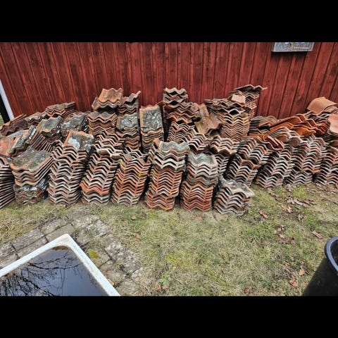 Enkupiga tegelpannor från 60-talet m beteckning E 13 4 HE BY (sannolikt fr Slottsmöllans tegelbruk), 125 st + ngr få nockpannor. Pannorna finns i Steninge, Halland