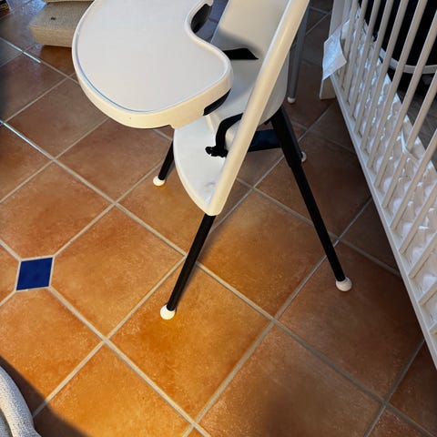 Stokke barnstol i vit plast med mörka träben. Stolen har sits, fotstöd och avtagbar bygel med fempunktssele för mindre barn. Passar som matstol vid bord och kan användas i hemmet eller hos barnvakt/morföräldrar. Designad för att ge stöd åt barnet vid sittande och enkel rengöring av ytorna.