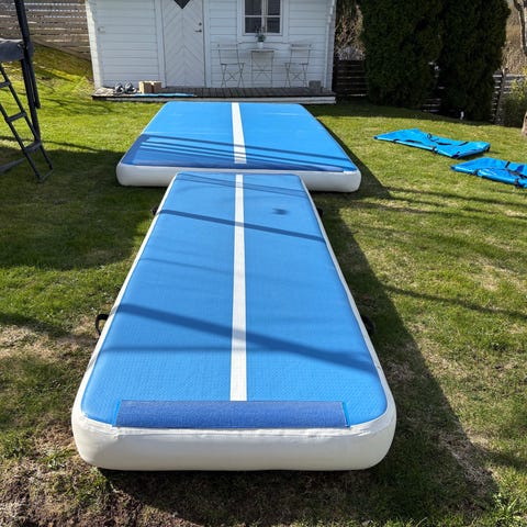 AirTrack vidaXL Uppblåsbar gymnastikmatta med pump 400x100x10 cm PVC blå. Den är stötdämpande, vattentät och halkfri vilket bidrar till trygghet. Den är mångsidig i bruk och kan användas inomhus för gymnastik, kickboxning, yoga och brottning. Den är också lämplig för utomhusaktiviteter såsom användning i simbassänger eller hav, lekar på gräsmattor och så vidare. Stark, hållbar och i fint skick. Använd sparsamt och skonsamt. Pump, väska och manual ingår. Nypris: 2343 kr. Finns i Flogsta i Uppsala.