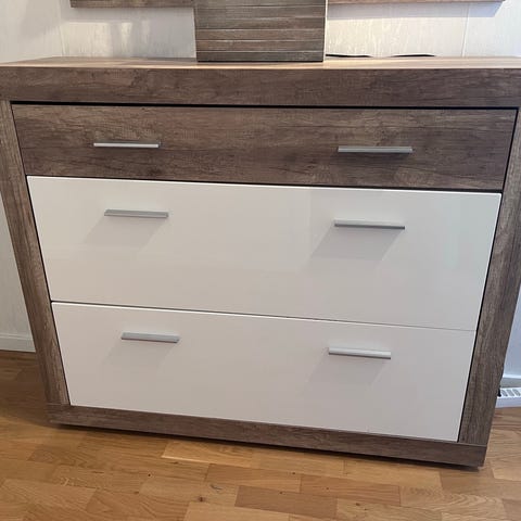 Hallbyrå med 2 stora lådor och övre rad med 3 mindre lådor. Bredd 1,2 meter. Djup 0,5 meter. Höjd 0,8 meter.