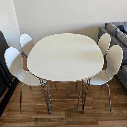 Litet vitt matbord med 4 stolar. Bordet har en skada på ena hörnet. Se bild. På grund av den glansiga ytan syns också lättare repor i vissa ljus. Inget jag stört mig på men nämnvärt. Kan hämtas på Lilla Essingen. Kan skicka dimensioner vid behov.