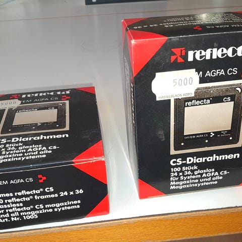 Rollei Magazin 77. 9 st diamagasin anpassat för 6x6 cm diabilder där ramens yttermått är 7x7 cm (därav namnet 77). Rymmer 30 diabilder.