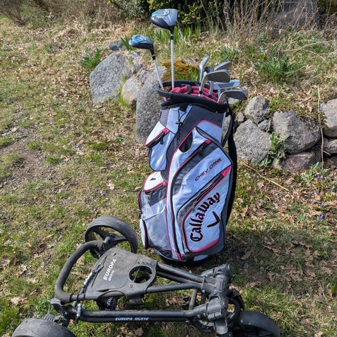 Titleist golfbag i svart och vitt. Väskan är avsedd för golfklubbor och har flera fickor för förvaring av tillbehör som bollar, handskar och andra småsaker. Bagen är utformad för användning på vagn, med stabil konstruktion och handtag som underlättar hantering på banan.