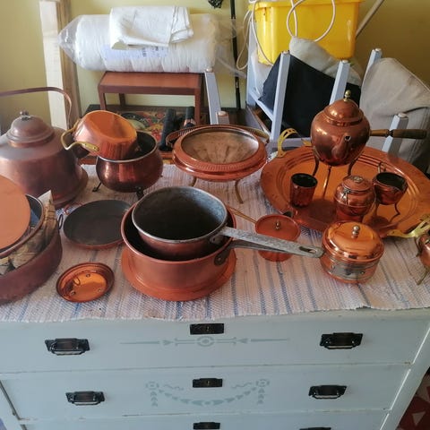 Blandat parti köksredskap och formar i koppar. I gruppen ingår flera väggformar med olika motiv, långskaftade slevar (varav en hålslev), mindre kastruller och koppar, samt en sockerkaksform och en stor pajform. Flera av delarna har upphängningsöglor för väggmontering. Passar som köksutrustning eller dekoration i kök och matsal. Exakta mått och antal delar framgår inte av bilderna och kan behöva kontrolleras vid intresse. Säljes allt ihop eller delar.
