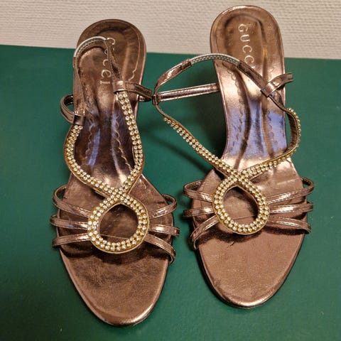 Märke Gino Ventori, finskor i form av damsandaler med klack i storlek 38. Skorna är i silverfärg med flera remmar över foten och öppen tå. Klack i mörk färg med smalare modell. Passar till exempelvis fest eller andra mer uppklädda tillfällen.
