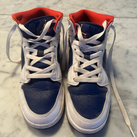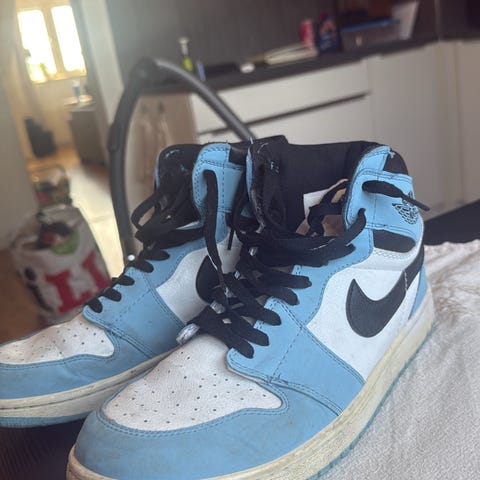 Nike sneakers i storlek 44,5. Skorna är i blå och vit färg med högt skaft och snörning. Ovandel i textil och syntetmaterial med perforerad tå för ventilation. Gummisula med klassisk Nike-logotyp på sidor och häl. Passar för vardagsanvändning och fritidsaktiviteter.