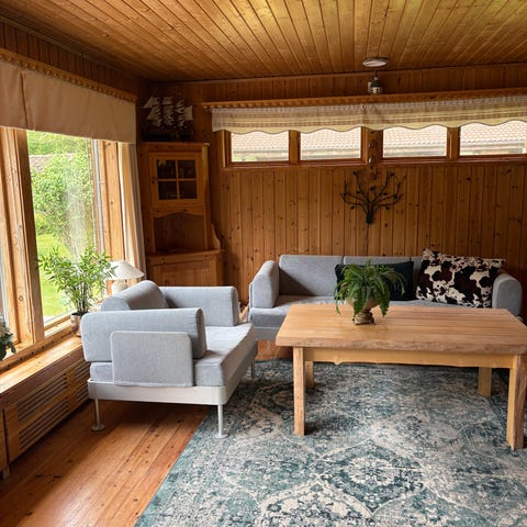 Bekväm grå soffa och fåtölj med fotpall från Burhéns i fint begagnat skick, dyr i inköp.